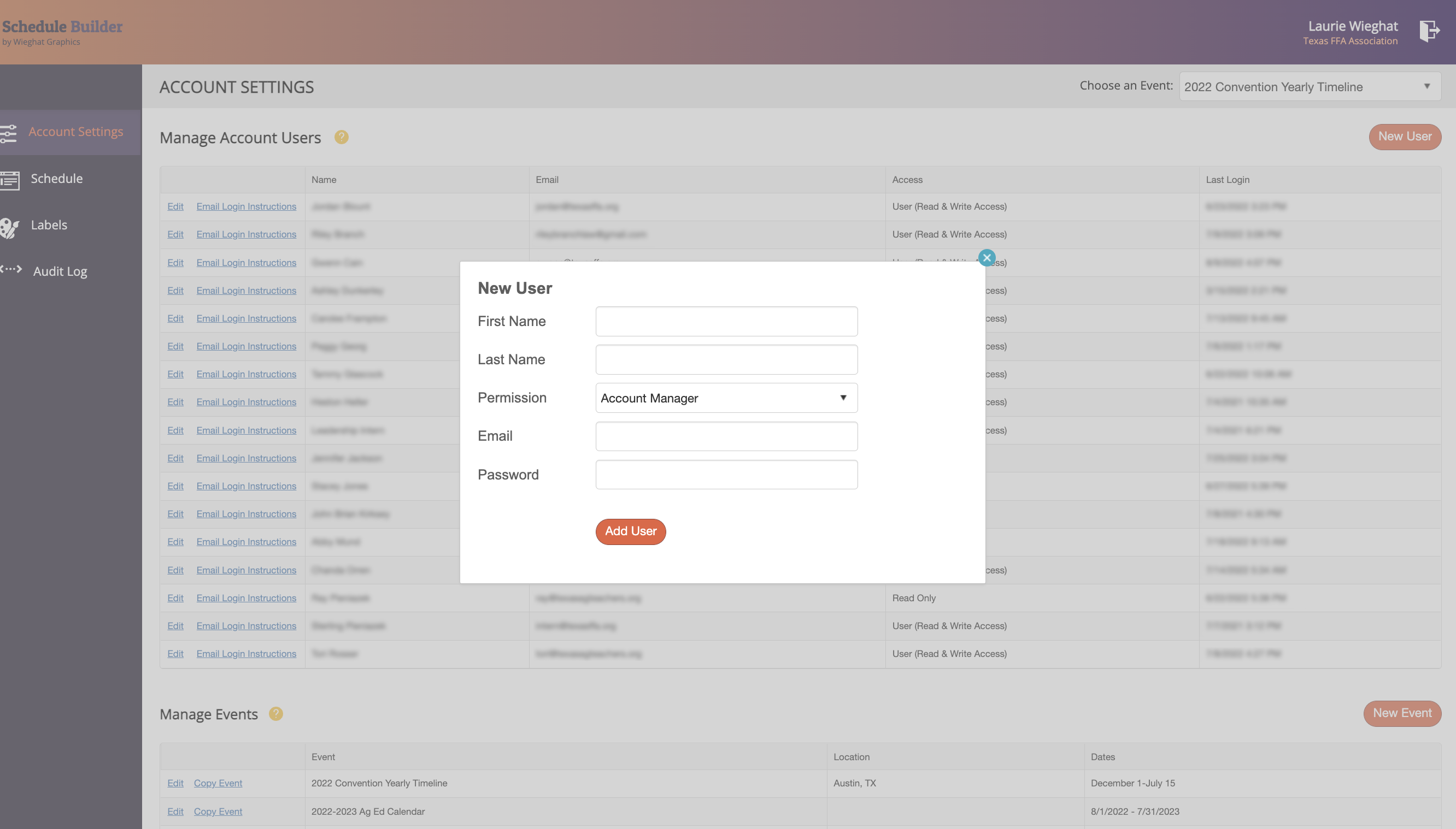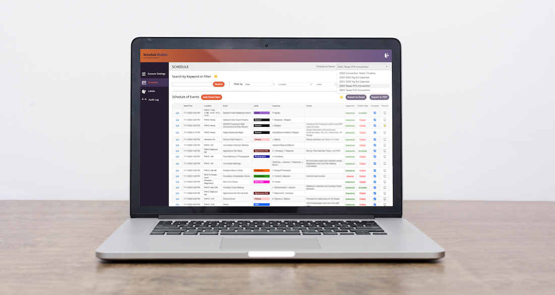 Schedule Builder is a flexible, collaborative web-based system that brings order to chaos of schedule management for conferences and events. Increase engagement before, during, and after your event. Use filters and labels for custom PDF and Excel reporting generated directly from the system. Empower team members to manage their own event items, set reminders, and more!